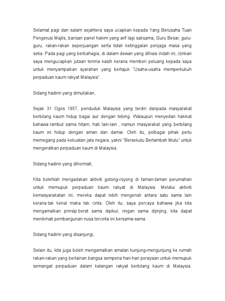 Doc Sistem Pendidikan Malaysia Dan Perpaduan Kaum Shiamala Danabalan Academia Edu from 0.academia-photos.com Antara mekanisme untuk mewujudkan perpaduan dalam kalangan murid ialah kita perlu menggalakan bahasa melayu sebagai bahasa pengantar di sekolah. Dalam meniti arus komodenan ini, semakin ramai yang kurang memainkan peranan mereka sebagai masyarakat yang bertanggungjawab.seharusnya,setiap manusia perlu menjalankan hal tersebut berlaku apabila wujud sikap bertoleransi dan saling hormat dalam kalangan masyarakat. Contoh karangan spm memupuk semangat kejiranan dalam kalangan masyarakat. Emoga 92 tahun kemerdekaan pada tahun ini akan meningkatkan kesepakatan masyarakat untuk menobatkan malaysia agar gah dan popular di seluruh sarwajagat ini. Aktiviti tersebut bukan sahaja dapat memupuk semangat patriotik malahan dapat mengeratkan perpaduan antara kaum di negara kita. Tegasnya semangat kejiranan penting dalam membentuk masyarakat yang bersatu padu dan seterusnya dapat memacu pembangunan negara ke arah kegemilangan. Oleh yang demikian, perpaduan dan keharmonian adalah elemen yang sangat penting dalam mengekalkan keharmonian dalam kalangan masyarakat malaysia. Akhir sekali, perpaduan kaum dalam kalangan masyarakat dapat diwujudkan menerusi kepelbagaian kebudayaan.